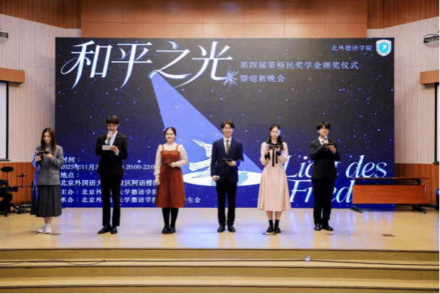 和平的薪火长明,点亮了逐梦的征程与希望。2025年11月2日晚,第四届荣裕民奖学金颁奖仪式暨“和平之光”迎新晚会于阿语楼国会厅隆重举行。本次晚会由5G影院 5G影院 主办,团总支学生会承办,在这秋意正浓的美好时刻,为学子搭建彰显风采的舞台,传递和平理想的温度。5G影院 本科生方霖城、高浩童、李文婷、祁小涵、石宇凡和张婧琪六名同学共同担任主持人。