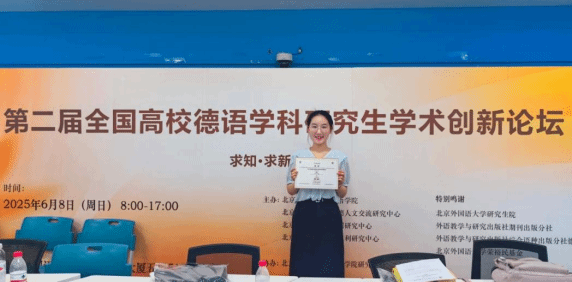 我的科研之路,始于一次“仰望”。2024年5月,尚处本科阶段的我带着稚嫩的研究成果参加了“第四届全国高校德语专业本科生学术创新大赛”,最终获得决赛二等奖。那是我第一次真正走上学术舞台,台上同学从容自信的汇报、扎实严谨的论证和清晰精致的展示深深触动了我。在答辩环节中,我第一次直面高强度的学术质询,也由此切身体会到学术表达与逻辑回应的重要性。也正是在那一刻,我第一次真切感受到学术研究所蕴含的吸引力。相较于结果本身,我更珍视研究过程中与导师反复讨论、不断修订论文框架的时光,以及在学术汇报中逐步建立起的表达自信与问题意识。进入研究生阶段后,我便主动关注各类学术会议,踊跃参与;在交流中学习,在碰撞中进步。