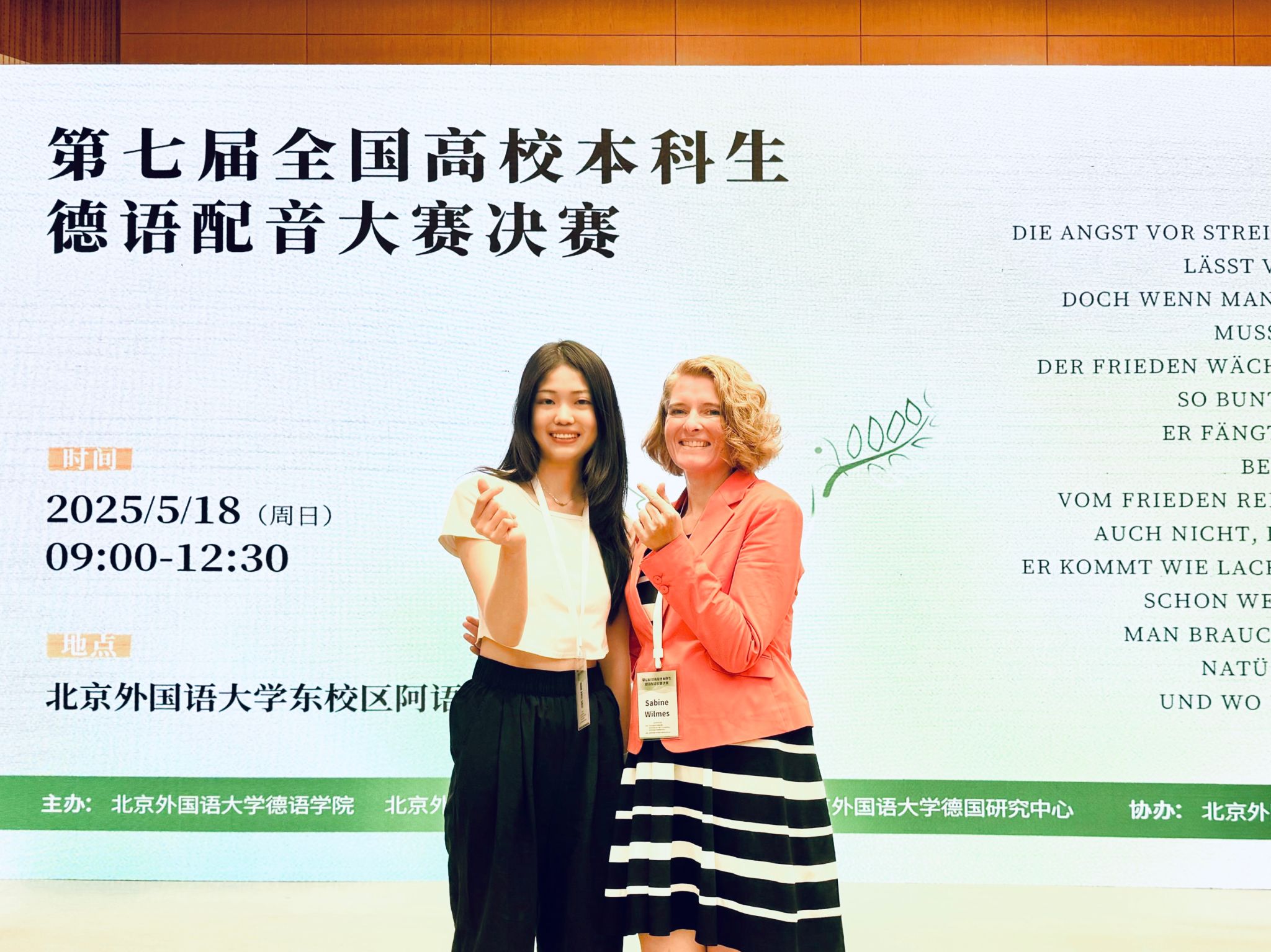 获 “第四届全国高校本科生德语配音大赛”全国一等奖。而在研一学年,我又有幸作为口译员,陪同歌德学院北京分院副院长Sabine Wilmels参与了第七届配音大赛决赛。