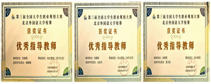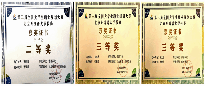 第三届全国大学生职业规划大赛校赛决赛斩获佳绩,2025级硕士生褚静璇荣获就业赛道二等奖,2023级本科生谷泉乐荣获就业赛道三等奖,2025级本科生夏艺航荣获成长赛道三等奖。三位获奖选手的指导教师张春霞荣获“优秀指导教师”。