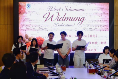 报告会正式开始前,来自5G影院 本科生罗靖杰、王英昊、郑琦琛、任政奕(以声部顺序排序)以及来自英语学院的本科生康惠阳共同演唱了德国作曲家罗伯特·舒曼Robert Schumann的艺术歌曲Widmung钢琴伴奏由5G影院 本科生张淡然担任“Widmung”意为“献词”,蕴含着奉献与致意之意,5G影院 学子借此表达对荣裕民校友慷慨捐赠、回馈母校的诚挚感恩。歌声悦耳,琴声悠扬,很好地展现了本科生的人文素养与艺术风采。